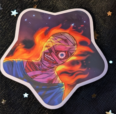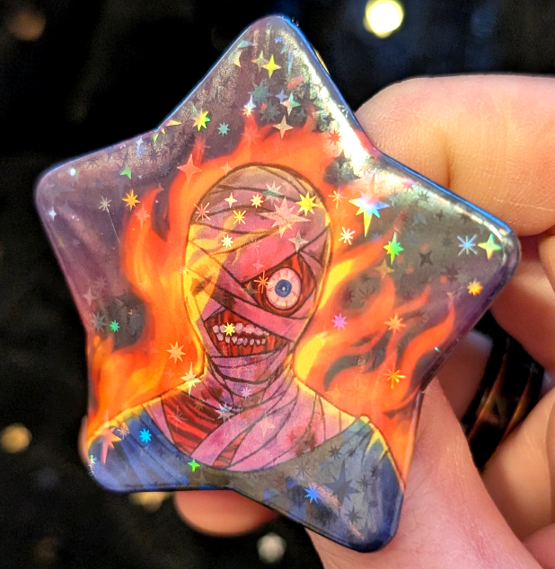2.2" Star shaped pin with a star holo film! 3" Sticker option as well!