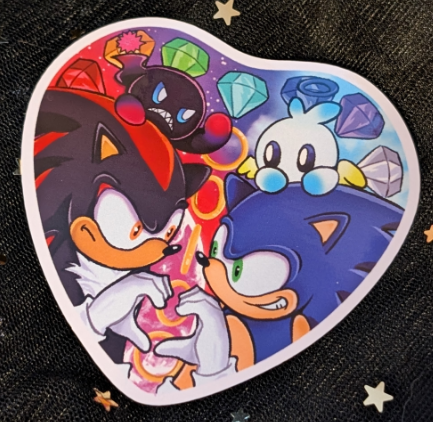 2.2" Heart shaped pin with Sonic, Shadow and Chaos with elements from Sonic Adventure 2 and comes with a heart holo film!